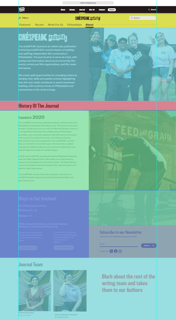 In this process I was working with a developer to take my high-fidelity prototypes and make them a reality. I remained conscious of the limits and potential challenges that can come with coding so I chose to do a layout that could translate well and be reused on a variety of pages. I achieved this with color blocking and typography. The basic "bones" of each page consisted of a color block with text and an image either to the left or right of the text box.