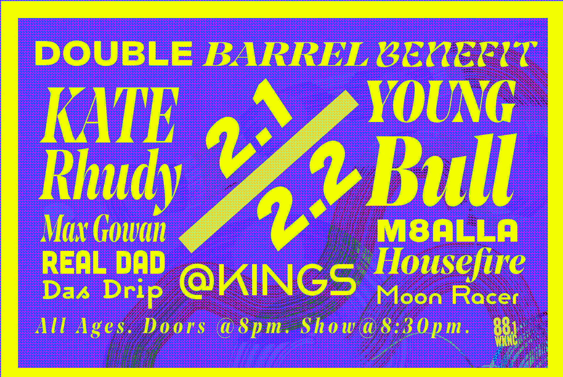 I created this poster to promote 88.1 WKNC's yearly event Double Barrel Benefit. Double Barrel Benefit is a two-night show that has various artists play music at a venue. Additional versions were created for the various media which the event would be promoted.