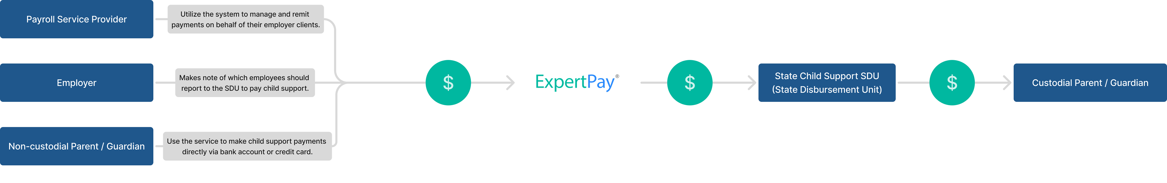 ExpertPay is a web-based centralized electronic payment center that complies with state requirements for child support disbursement. The platform allows for the storage of employee withholding information, scheduling of payments, and maintenance of electronic records for transactions.