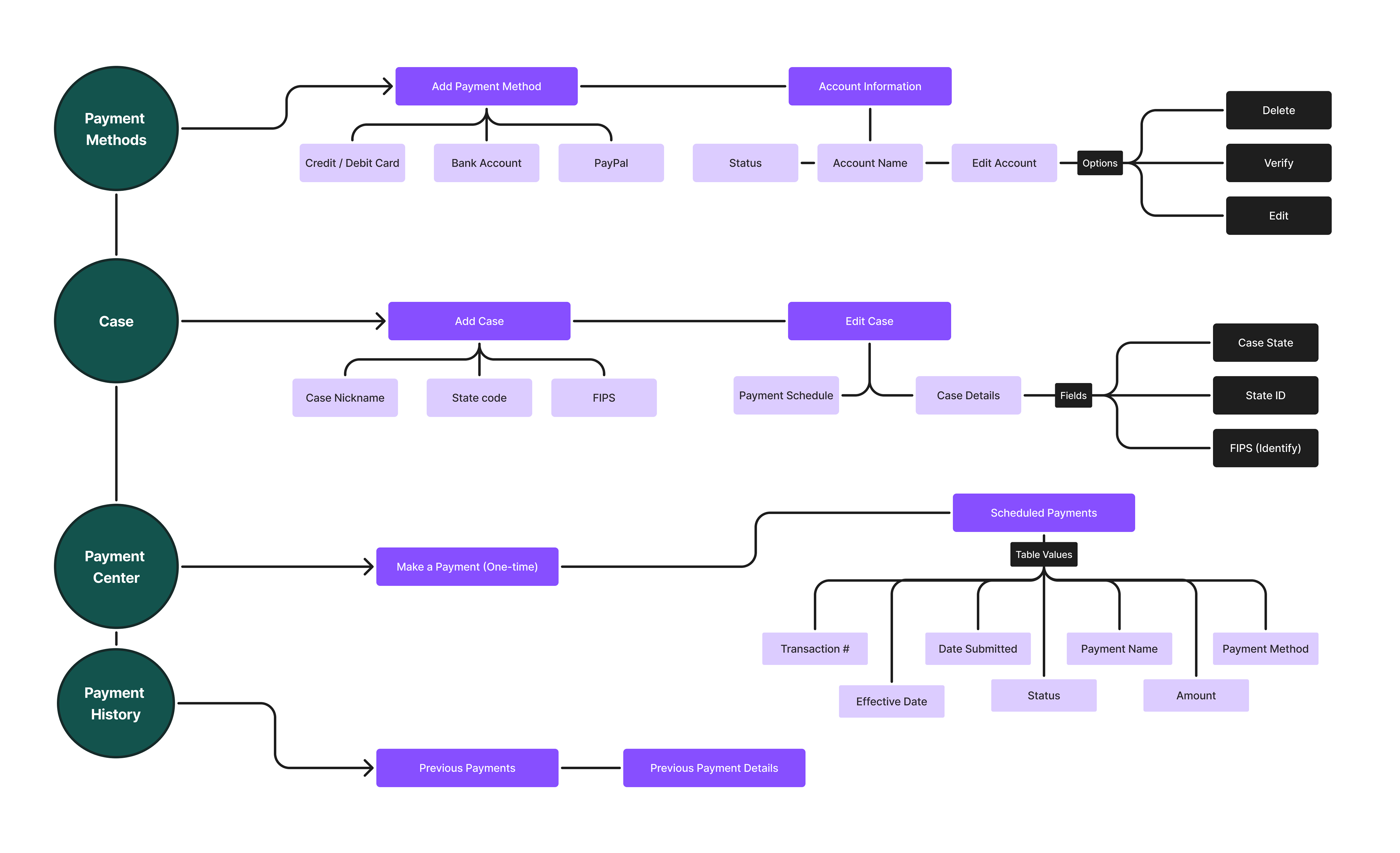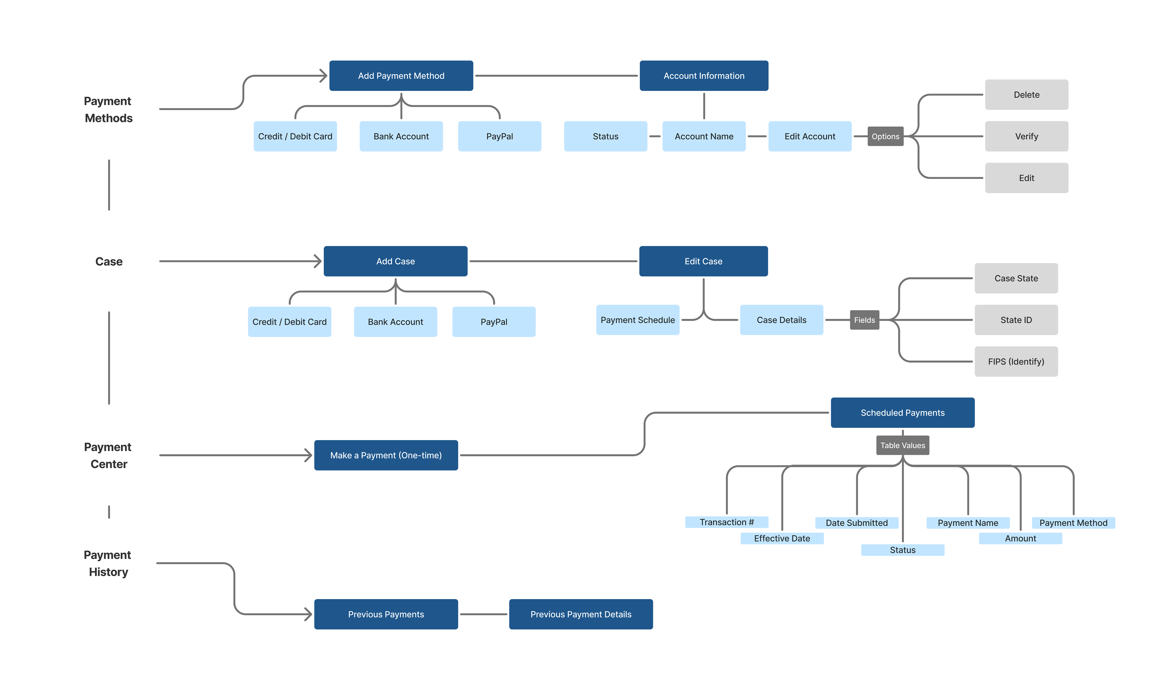 The main sections of the app consist of Payment Methods, Cases, Payment Center, and Payment History. They served as guide for how the app should be organized and function.
