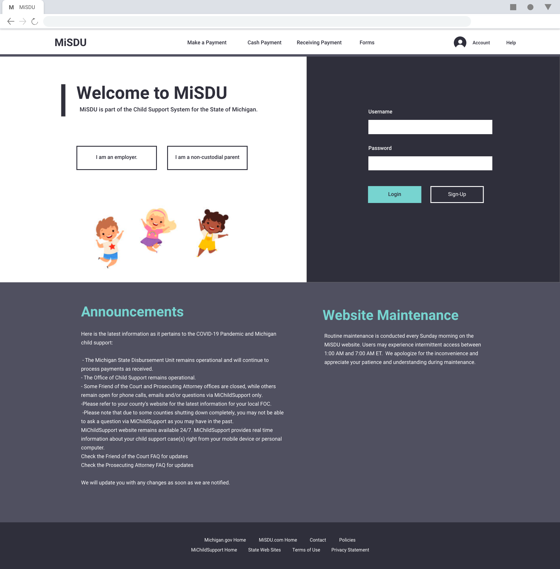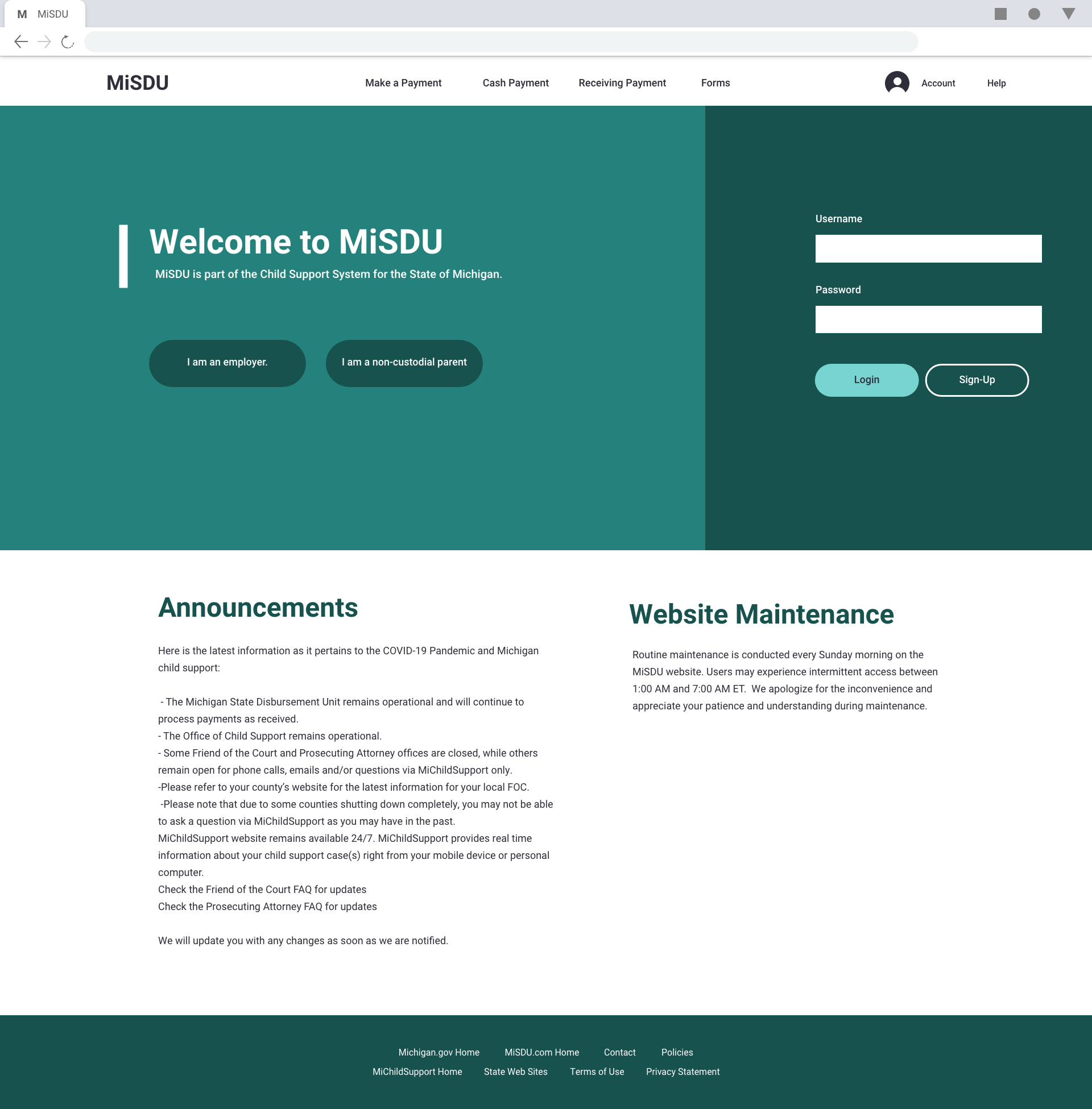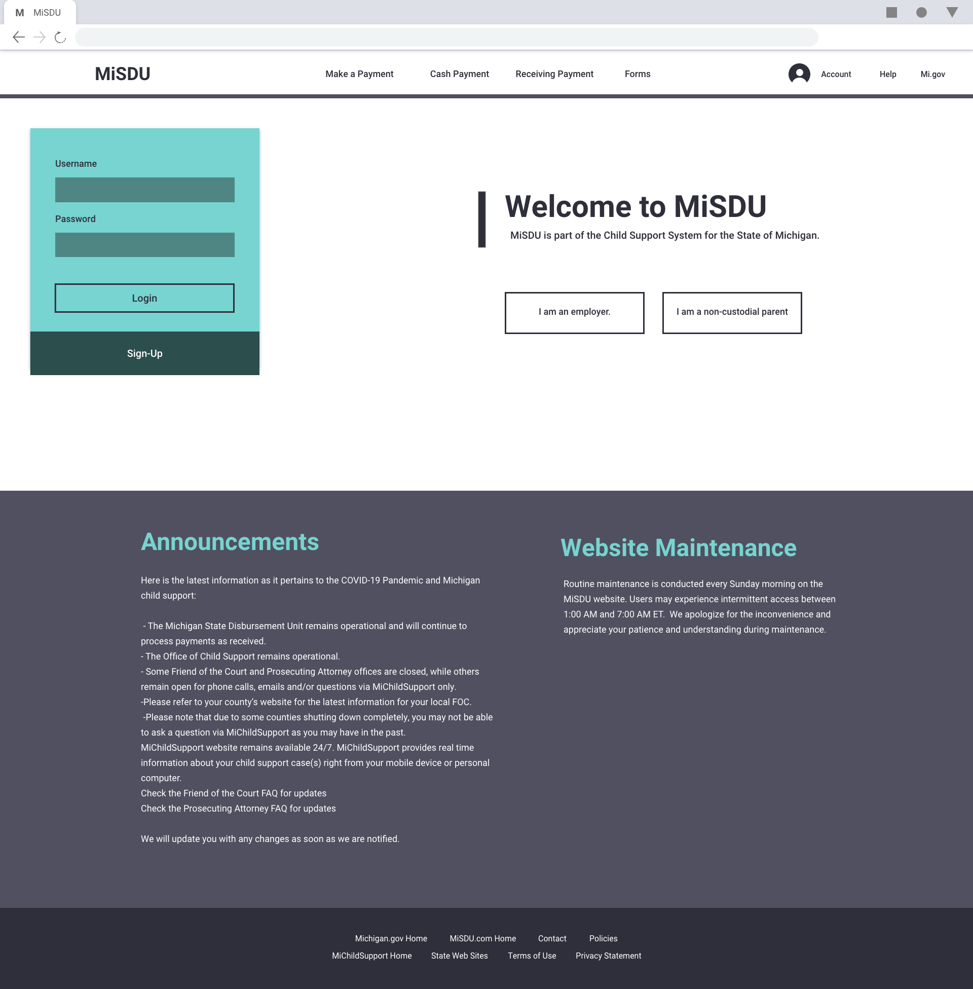 I decided to begin with the logo. The current website/system did not have a concrete logo or style. I used the current logo and the Michigan.gov logo to create the new logo for MiSDU. The same elements were used but, were just modernized to match the direction the main website was taking.
