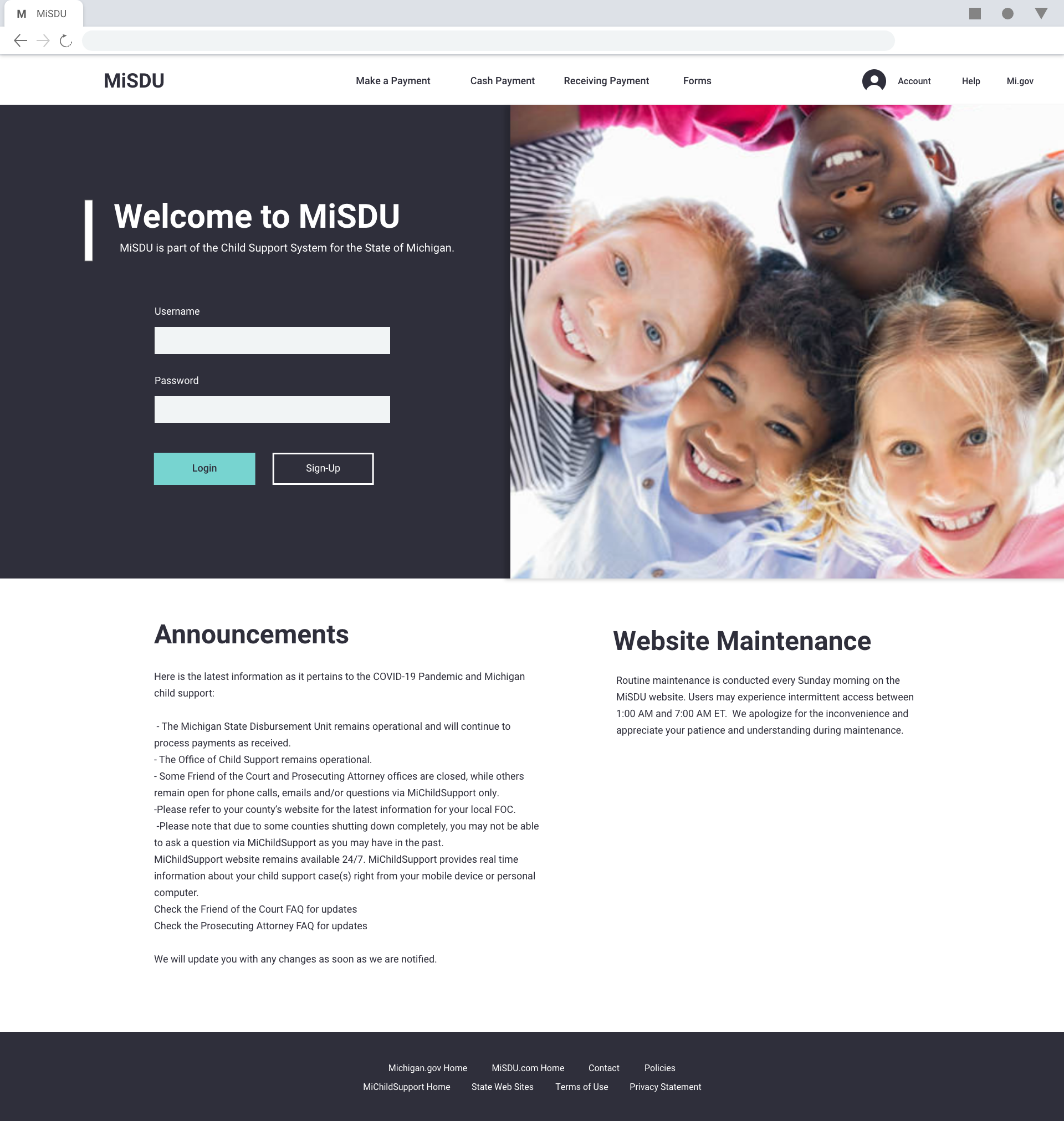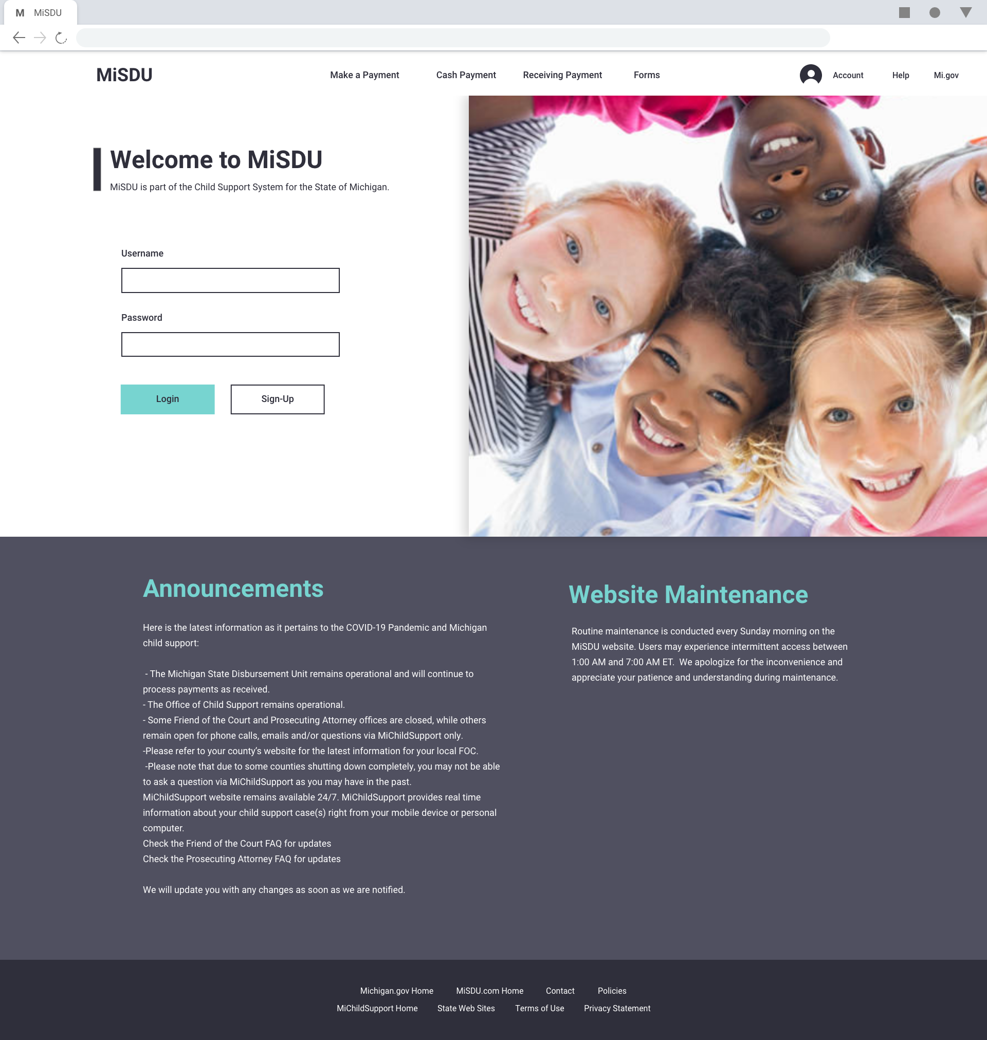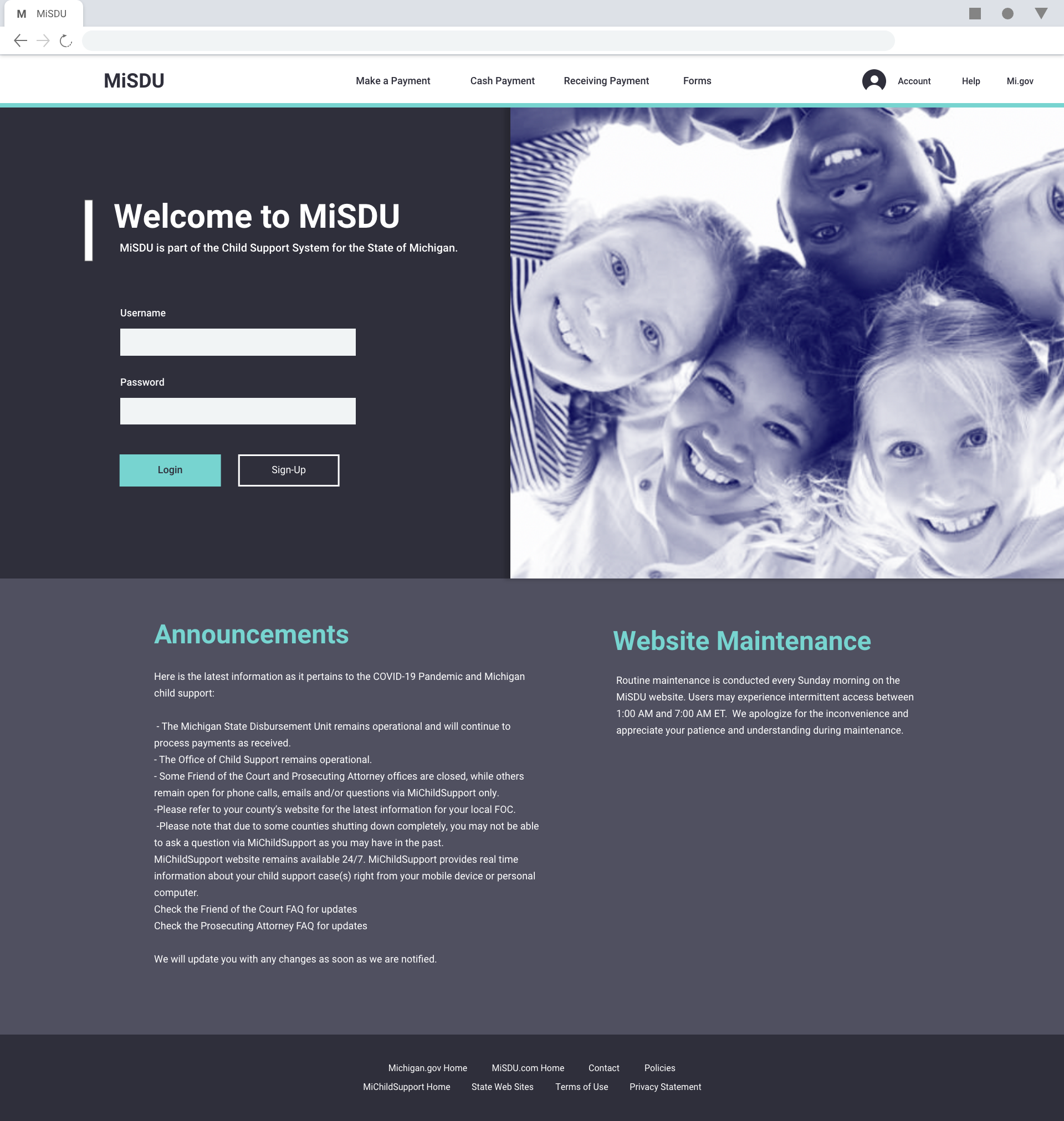 I decided to begin with the logo. The current website/system did not have a concrete logo or style. I used the current logo and the Michigan.gov logo to create the new logo for MiSDU. The same elements were used but, were just modernized to match the direction the main website was taking.