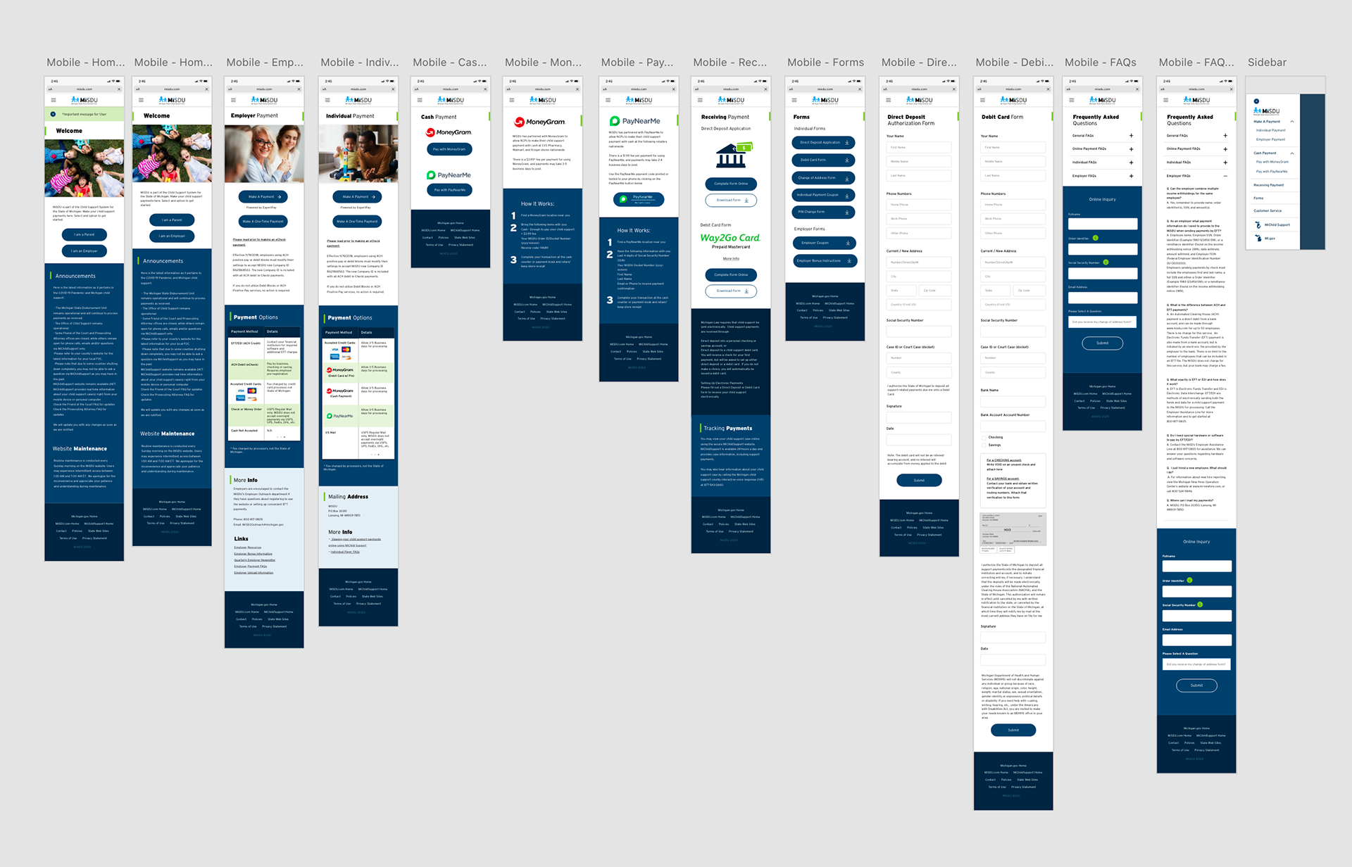 The look of the website for Michigan child support wasn't the only thing I had to take into consideration. At the time the stakeholders (State of Michigan & ExpertPay) were not sure of how they wanted the user to interact with the site and how the portal would lead to another website/service ExpertPay. As a result, I had to show 4 different scenarios for how this interaction could be achieved.