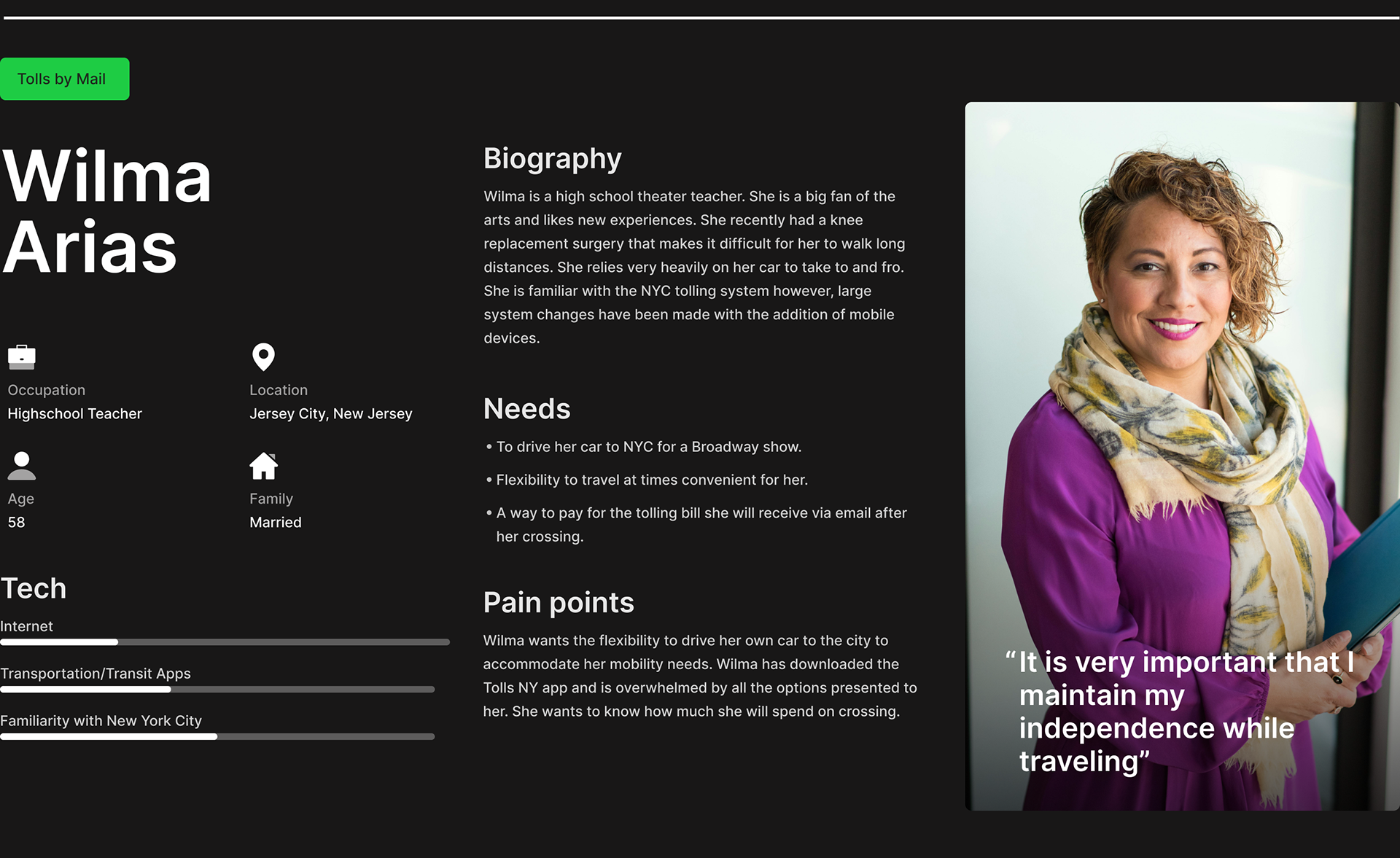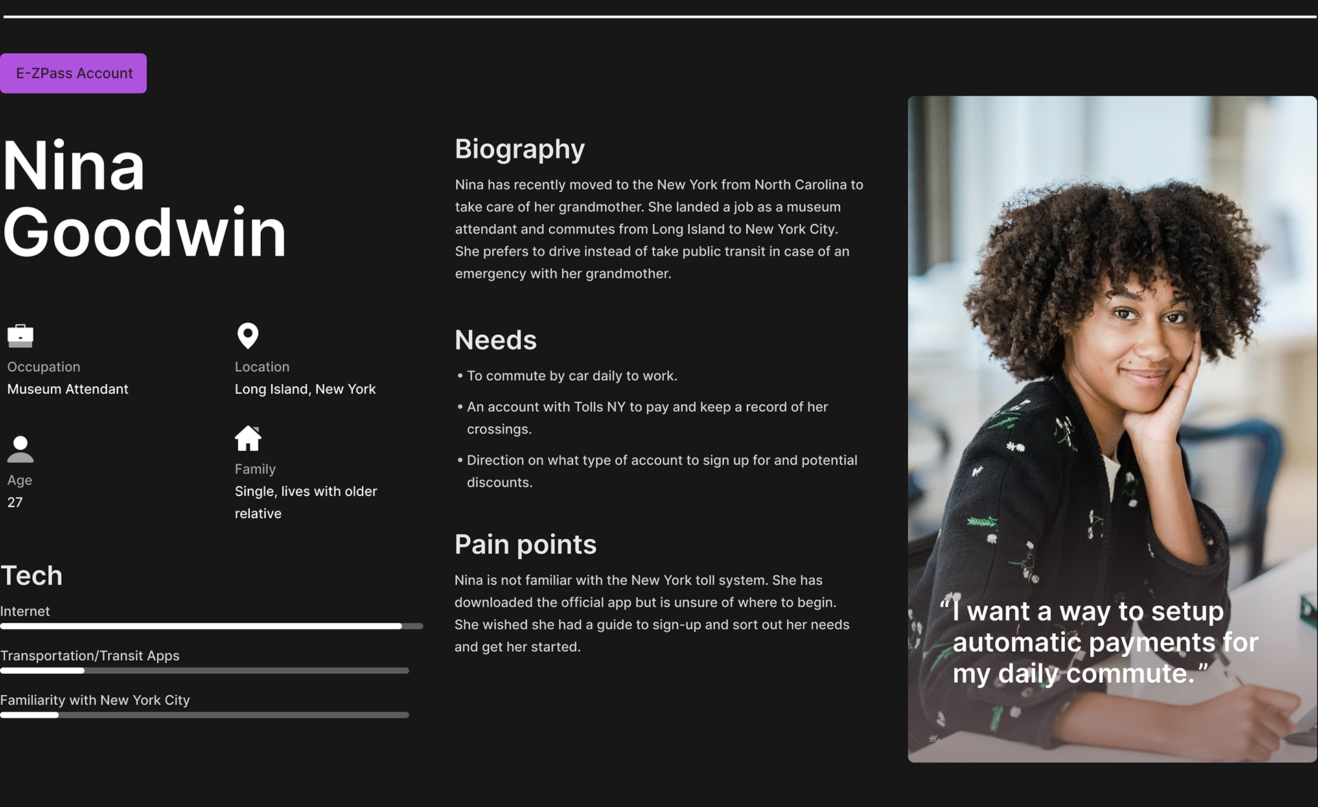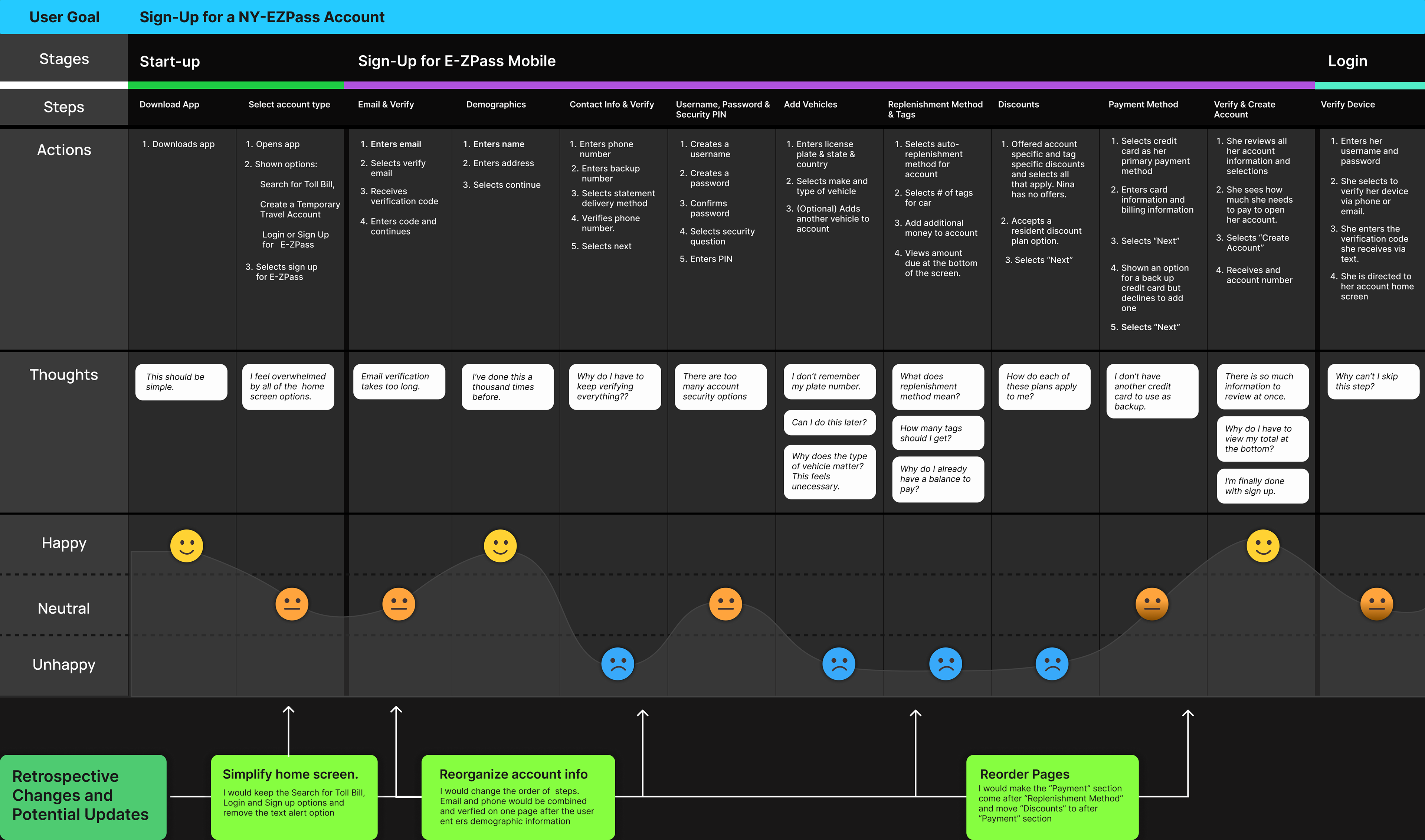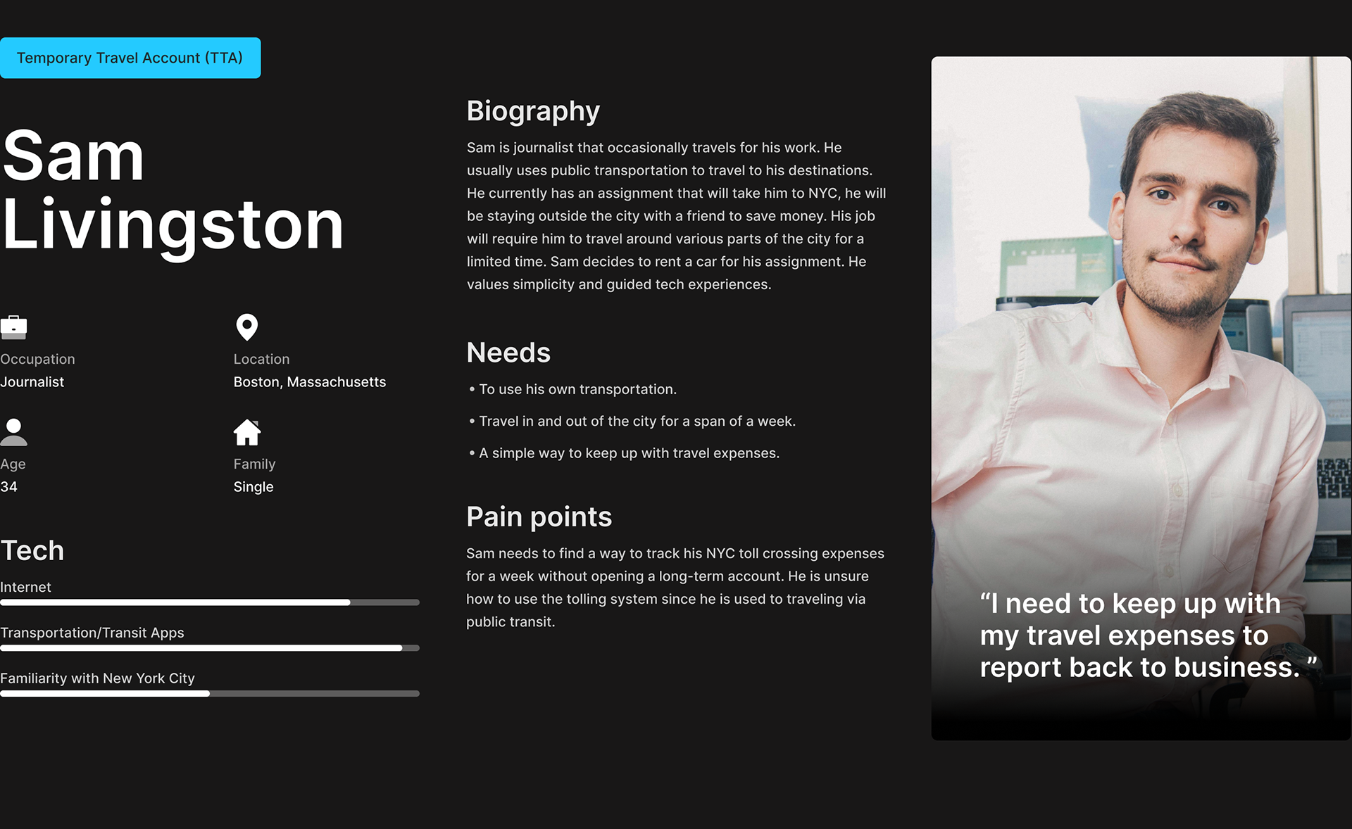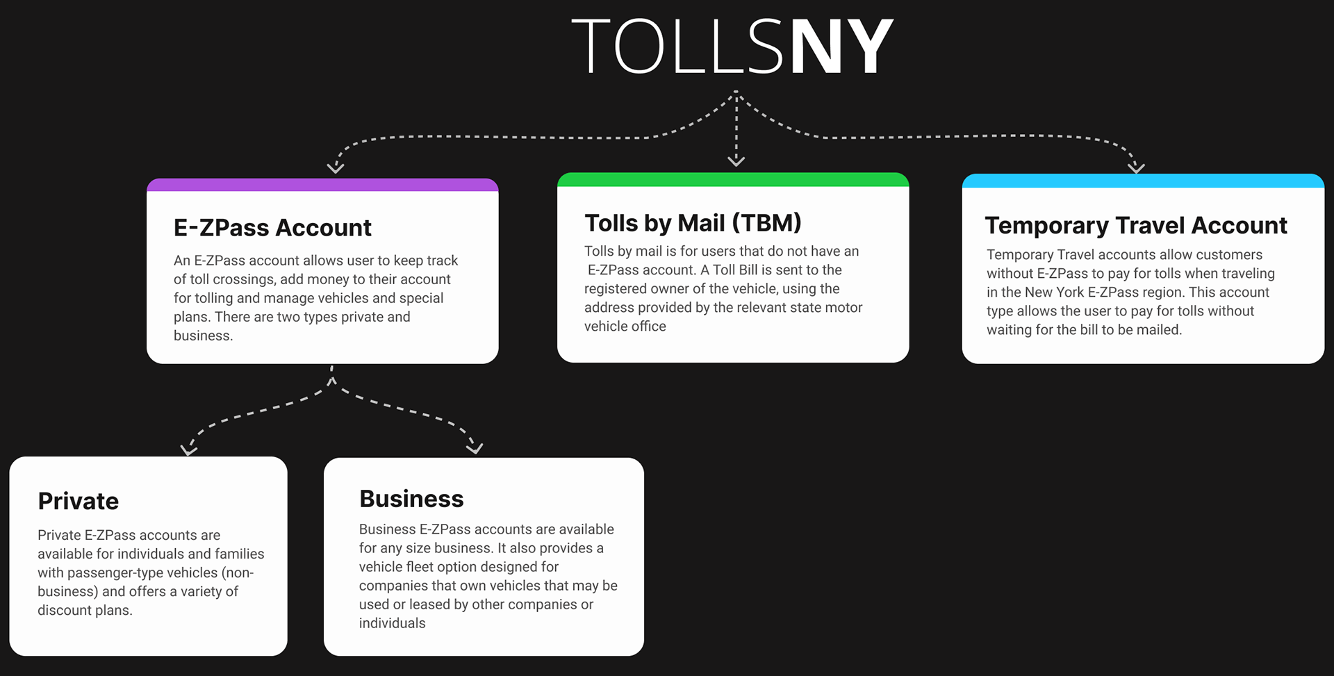 This app was very large and complex. Countless types of users would be using this app. I created personas with needs based on each type of account: Temporary Travel Account, Tolls by Mail, and NY E-ZPass and illustrated the scenarios in how individual personas would make use of them.