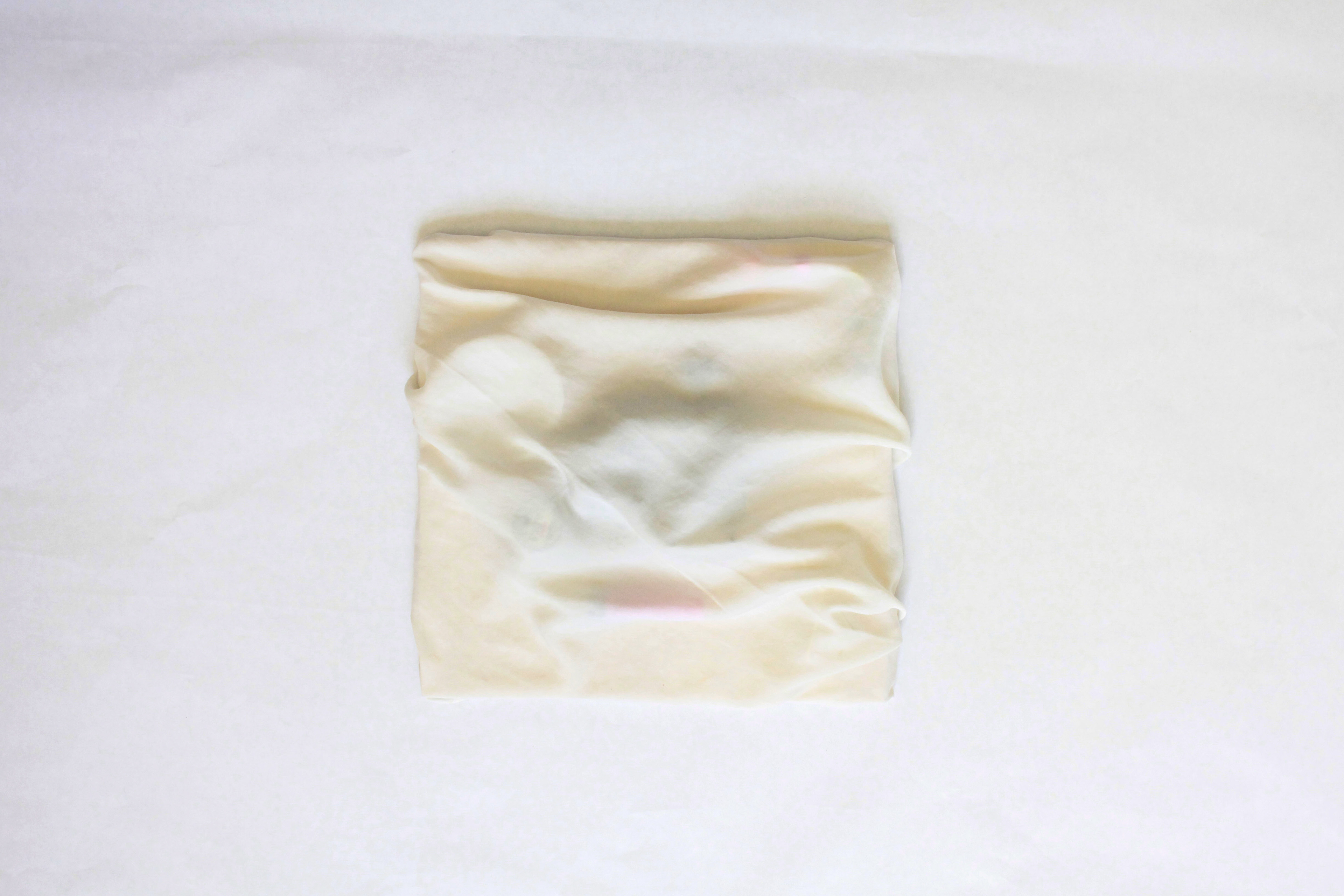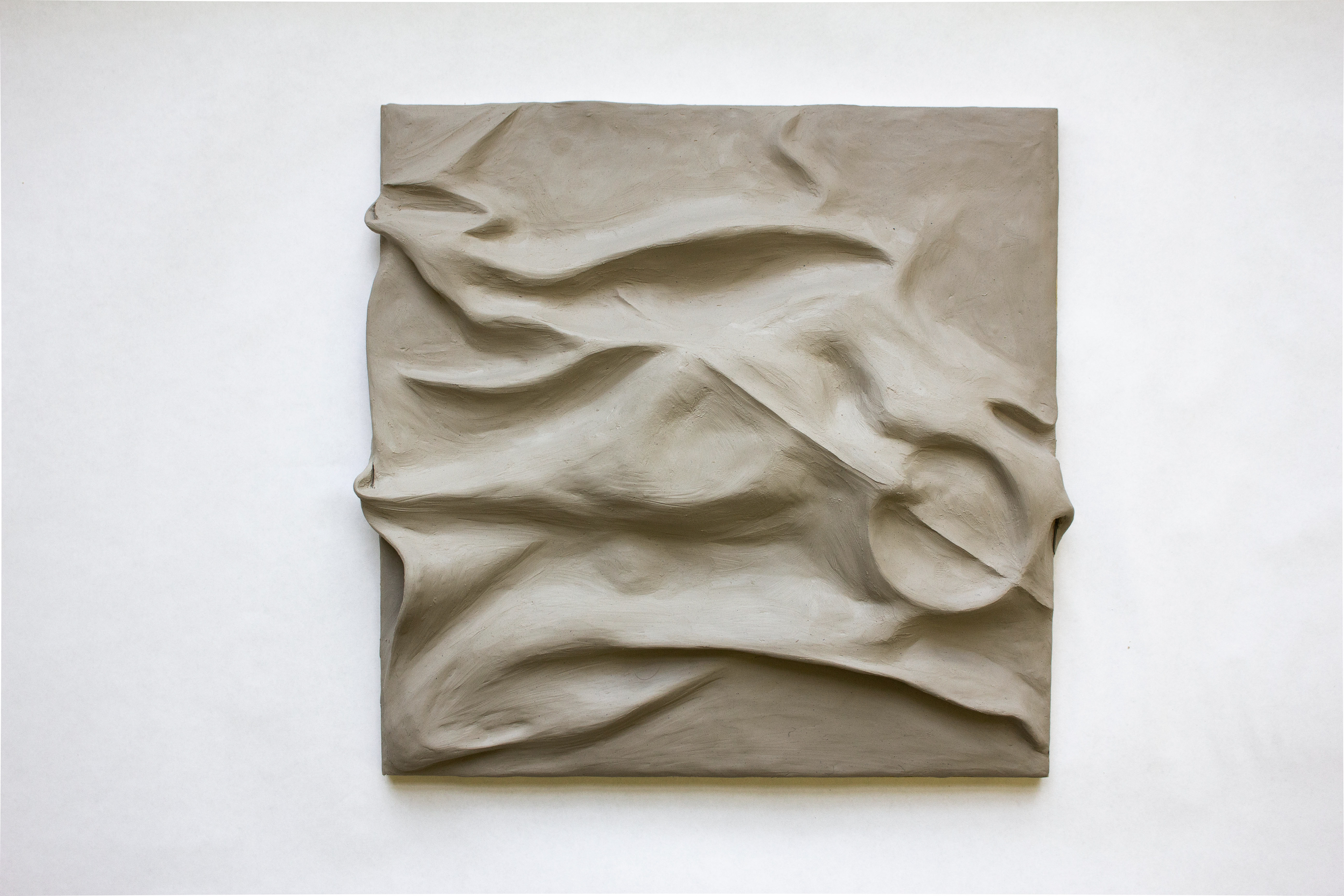 Translating form between mediums. i. 12x12 in board with items attached. ii. Then covered in fabric. iii. The fabric covered form translated into clay.